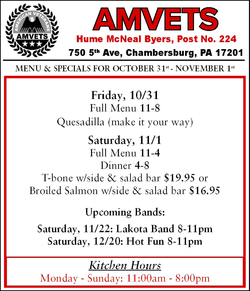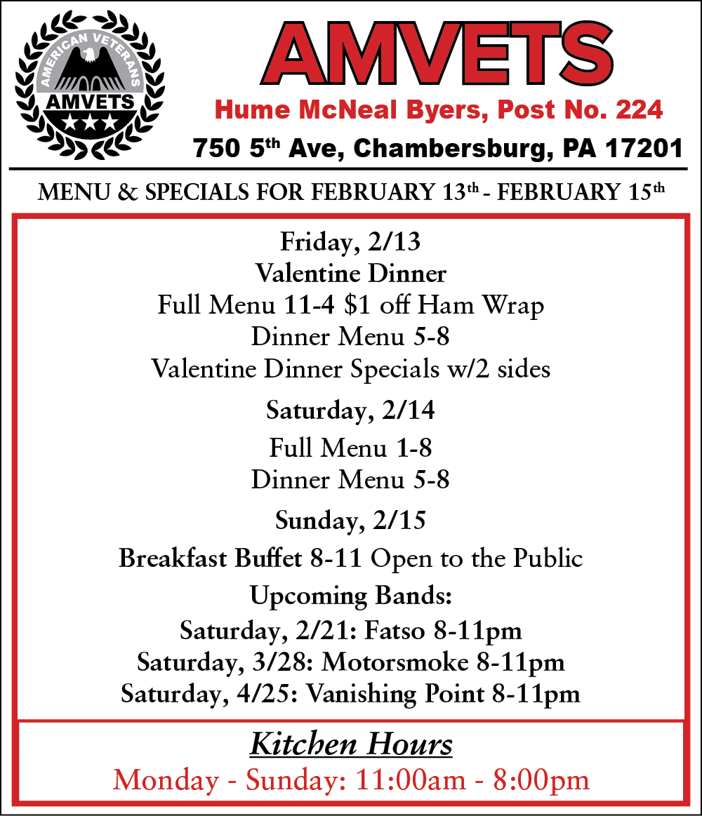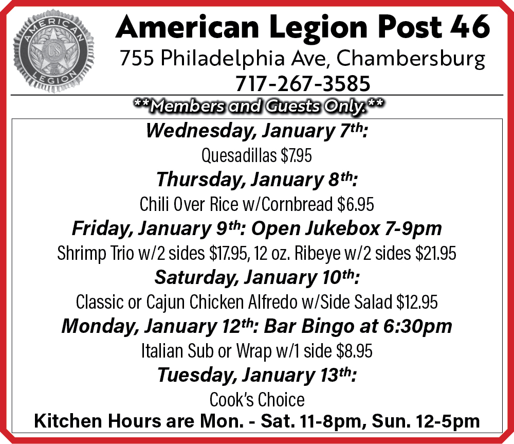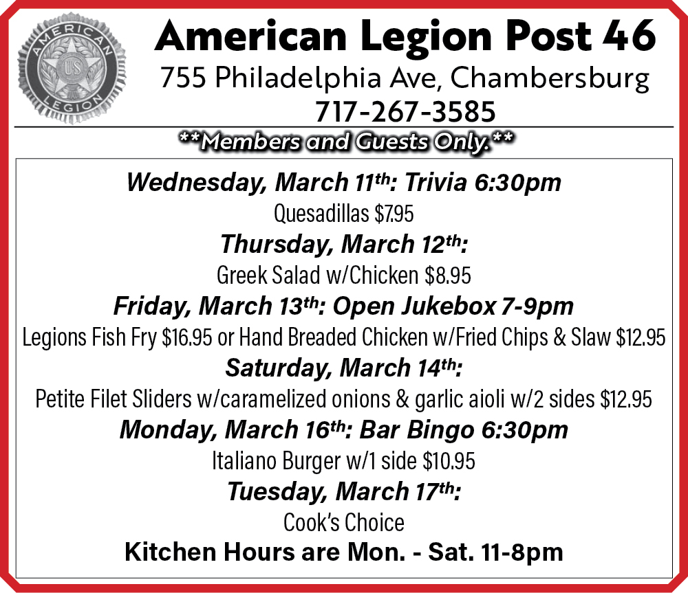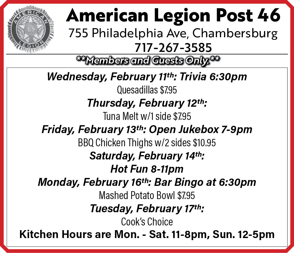 Our Club Happenings page is updated each week and features weekly lunch and dinner specials from local service clubs in Chambersburg plus surrounding areas including the Elks Lodge, Marine Corps League, VFW & Chambersburg Moose.