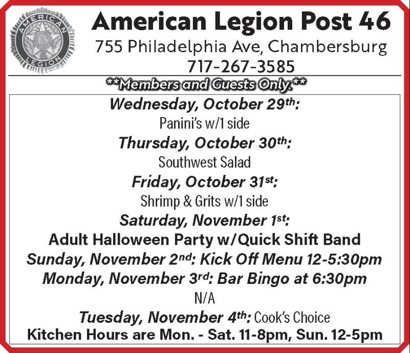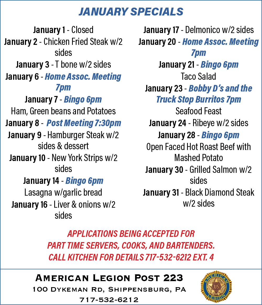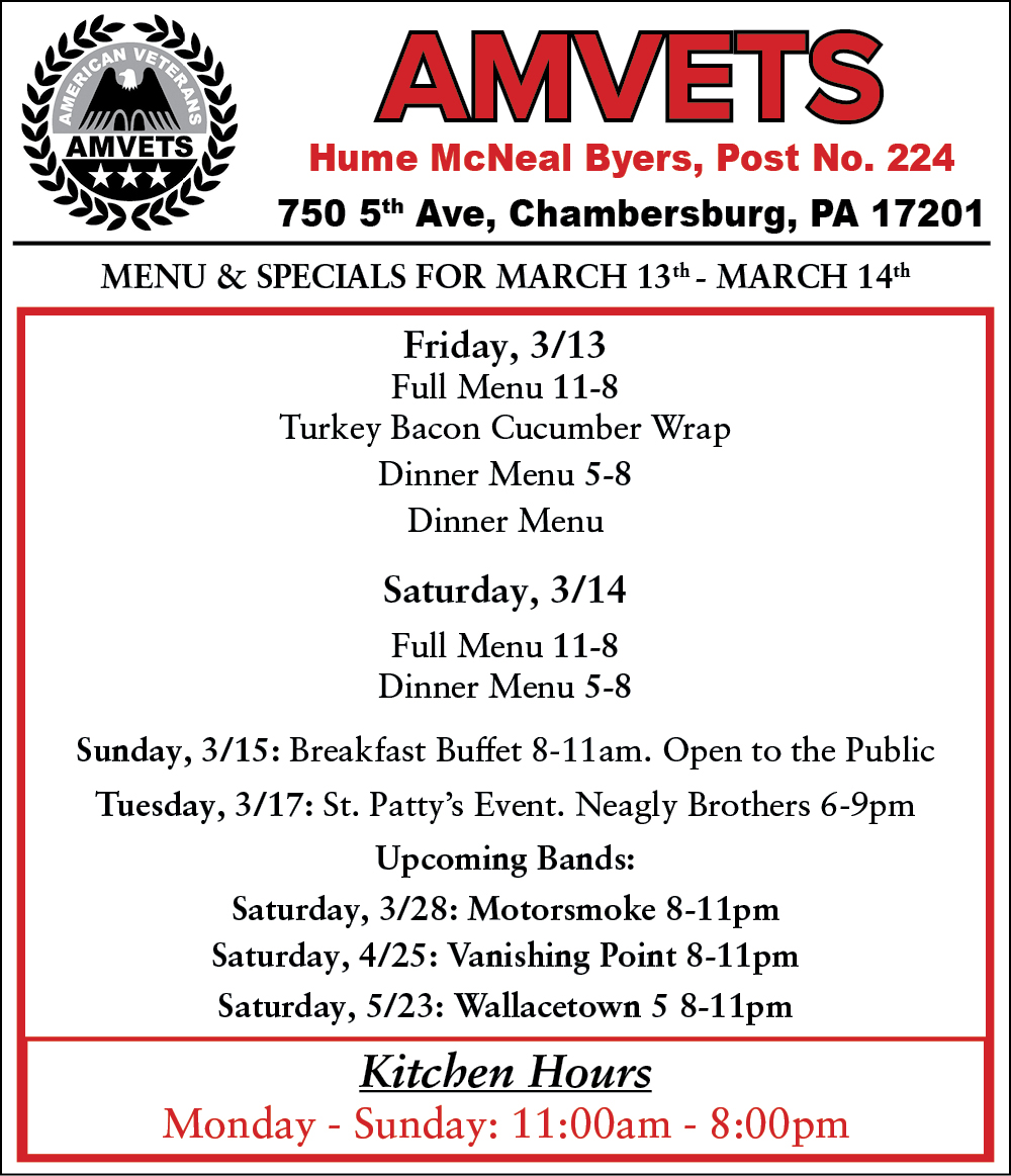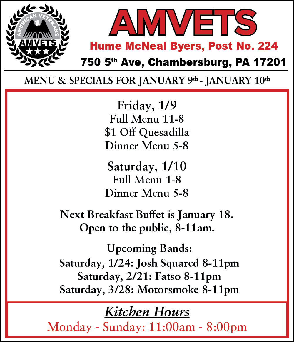 Our Club Happenings page is updated each week and features weekly lunch and dinner specials from local service clubs in Chambersburg plus surrounding areas including the Elks Lodge, Marine Corps League, VFW & Chambersburg Moose.